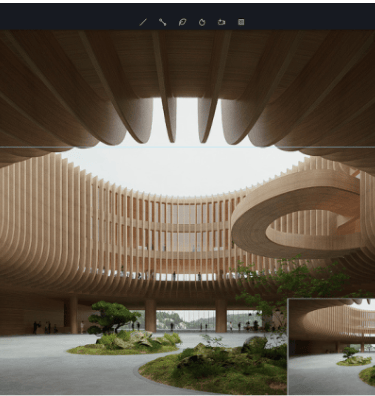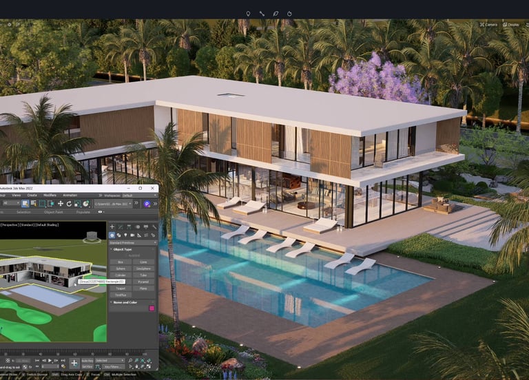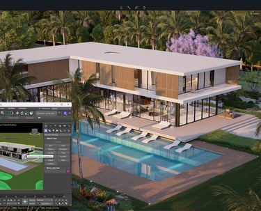 Render en tiempo real con D5 Render, creación de imágenes fotorrealistas y desarrollo de recorridos virtuales inmersivos para presentaciones profesionales.